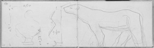 [Image : François Pompon, Album: étude pour un ours; croquis avec mesures d’un buste (?); (carnet pris à l’envers), Paris, Musée d’Orsay, conservé au Musée du Louvre ]