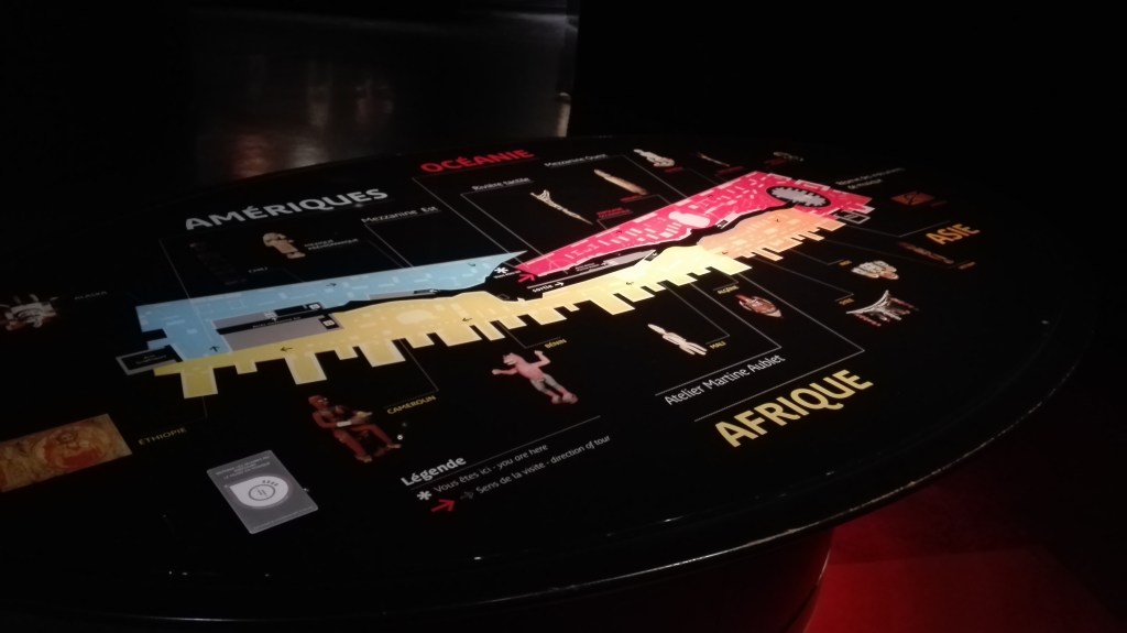 Pour répondre à ces questions, la visite-expérimentation était construite autour de trois temps d’expérimentation au sein de l’espace des collections permanentes du Musée du quai Branly – Jacques Chirac, destinés à aborder respectivement l’ambiance du lieu et son impact sur l’expérience du visiteur, le contenu des cartels et les enjeux de l’audiodescription des œuvres, et l’environnement sonore.