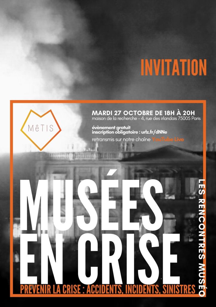 Les musées traversent actuellement une période exceptionnelle. Depuis plusieurs mois, face à l’épidémie, le champ muséal se réorganise, se réinvente, se reprojette, et ce malgré l’avenir encore peu prévisible. La période a révélé la nécessité, pour le milieu de la culture, de se préparer et de prendre des mesures face à des menaces jusqu’à lors méconnues – comme la pandémie. Ce cycle de rencontres est ainsi dédié à la crise, et propose trois temps de réflexion : la prévention, la gestion, la résilience. Les musées sont en effet confrontés quotidiennement à des imprévus, des urgences, des menaces et des tensions – de moindre ou de grande ampleur. Les regards croisés des chercheurs et des professionnels invités seront mis en perspective, à chacune des séances, avec une typologie de la crise : la prévention d’accidents, d’incidents et de sinistres (travaux du bâtiment, vandalisme, vols d’œuvres) ; la gestion de calamités naturelles (incendies, inondations, éruptions volcaniques, ouragans, tremblements de terre, changements climatiques) ; et la résilience des musées après les conflits armés (guerres, pillage, terrorisme).