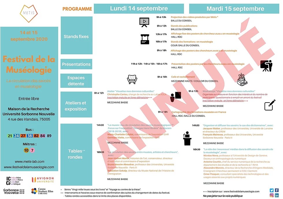Sur ce modèle et inspirée par ces initiatives, l’équipe de l’association Mêtis a souhaité développer au printemps 2020 à Paris le premier “Festival de la muséologie”. Nos expériences académiques nous ont montré que la muséologie, discipline récemment structurée et légitimée, regroupe des chercheurs de tous domaines (SIC, anthropologie, histoire de l’art, etc.) et se développe dans des lieux variés (musées, universités, associations, etc.). Il nous paraît donc crucial que, d’une part, les acteurs de cette recherche se rencontrent, mais surtout que les résultats de leur travail, leurs méthodes et leurs ambitions puissent se déployer auprès des premiers intéressés : les publics, les institutions culturelles, leurs tutelles administratives et politiques, et les professionnels du monde muséal, tous métiers confondus.