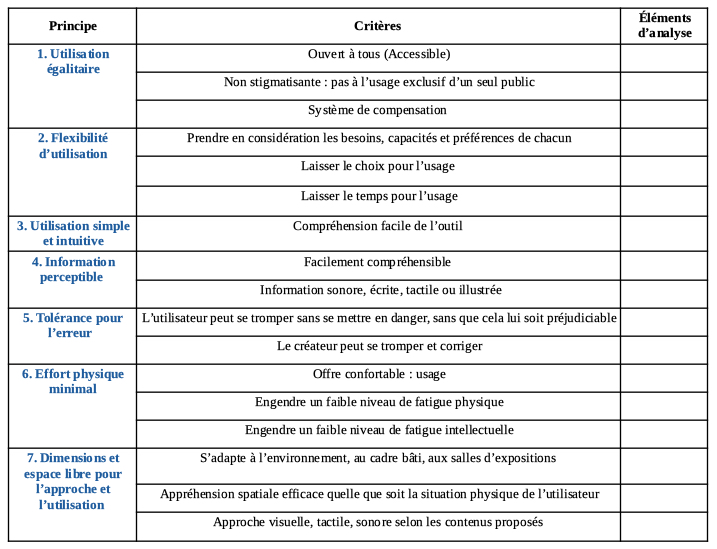 La première étape a consisté en la visite du musée des beaux-arts d’Arras accompagné de l’outil Musée Accessible. L’ensemble a fait l’objet d’une évaluation, basée sur une grille d’analyse (Figure 1) comprenant les 7 principes de la conception universelle, définis en 1997 par le Centre pour la conception universelle, et des critères précis qui en découlent. Cette dernière permet d’envisager, d’une part le dispositif Musée Accessible dans son environnement, et d’autre part les trois formes d’accessibilité (physique, sensorielle et intellectuelle) au sein de l’institution et ses services de manière globale. De plus, elle permet de compenser l’absence des visiteurs concernant l’appréhension du dispositif dans les salles.