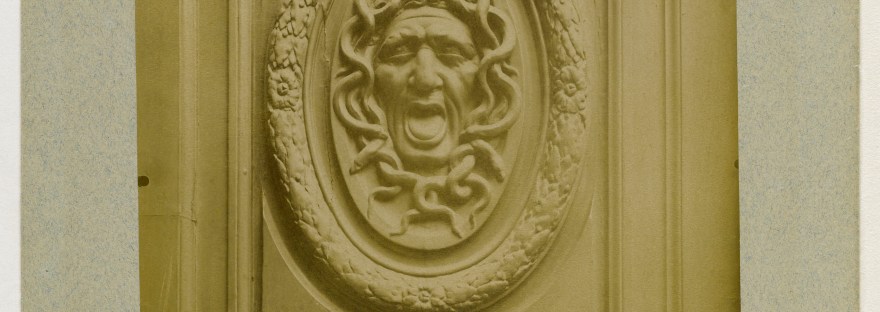 [Illustration : Eugène Atget, Panneau avec méduse sculptée, détail de la porte, façade sur rue, hôtel des ambassadeurs de Hollande 47 rue Vieille-du-Temple, 4ème arrondissement, Paris, XIXe siècle, photographie, Paris, Musée Carnavalet, Collection en ligne, Paris Musées]