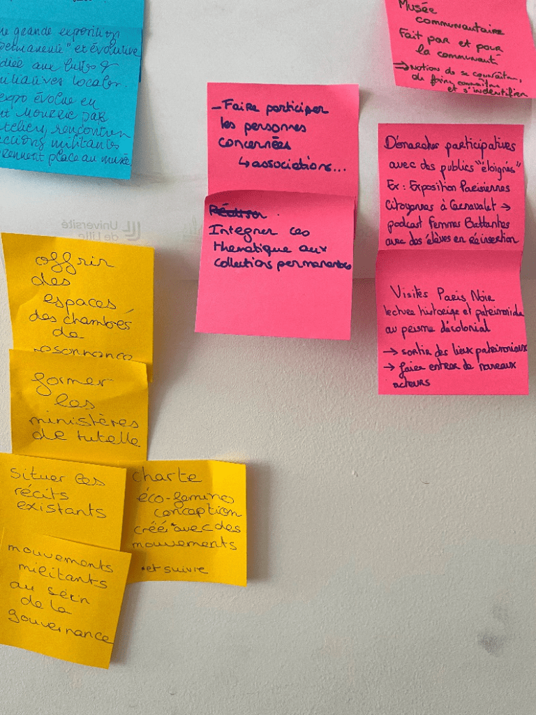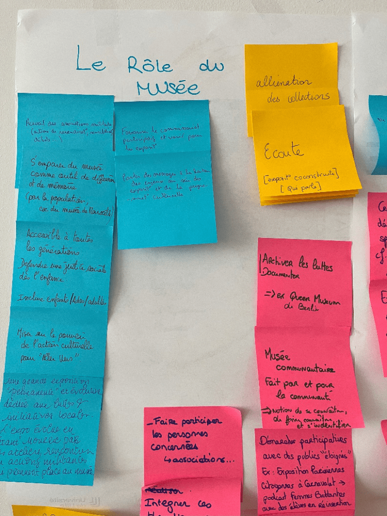 Certains participants ont également souligné le potentiel des musées comme lieux de mémoire et d’action collective. Pourtant, ces institutions ne sont pas suffisamment perçues comme « des outils au service des populations » pour défendre leurs causes. Pour favoriser une approche plus inclusive, il a été proposé de promouvoir des commissariats participatifs et variés dans les expositions, afin de briser le rapport vertical entre les institutions et le public, et d’ouvrir la voie à une multiplicité de voix et de récits alternatifs (ex. Podcast Femmes Battantes à l’expo Paris Citoyennes).