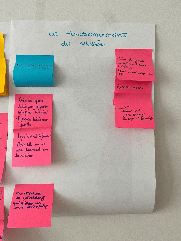En outre, les participants ont souligné l’importance de partager la légitimité de prise de parole et de rôle, en favorisant une approche plus inclusive et horizontale : « Les musées devraient apprendre à se taire, pour mieux écouter ». Le but est de donner de la place aux autres personnes ayant un autre rapport à l’objet, à l’héritage… Par ailleurs, des principes tels que la non-mixité ont été évoqués pour favoriser une prise de parole plus libre et moins centralisée par des groupes d’employés. Par exemple, ils ont évoqué la possibilité d’adopter des pratiques telles que l’écriture collaborative des cartels (par exemple au Palais de beaux-arts de Lille, un comité d’écriture incluant des employés dans plusieurs services hors curatelle a été créé afin d’écrire les cartels): De plus, l’organisation de contre-visites ou la création d’assemblées citoyennes ou de groupes mixtes permettraient de libérer la parole, même s’il a émis un avis sur la rémunération des collectifs militants collaborant avec les musées.