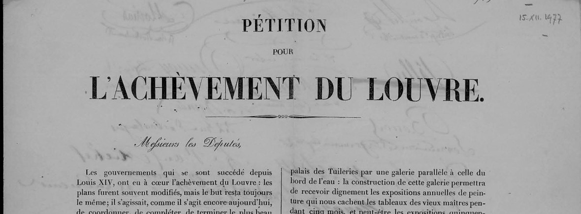 [Illustration : Anonyme. Pétition pour l’achèvement du Louvre. 19e siècle. Bibliothèque centrale des monuments nationaux, collections en ligne INHA.]