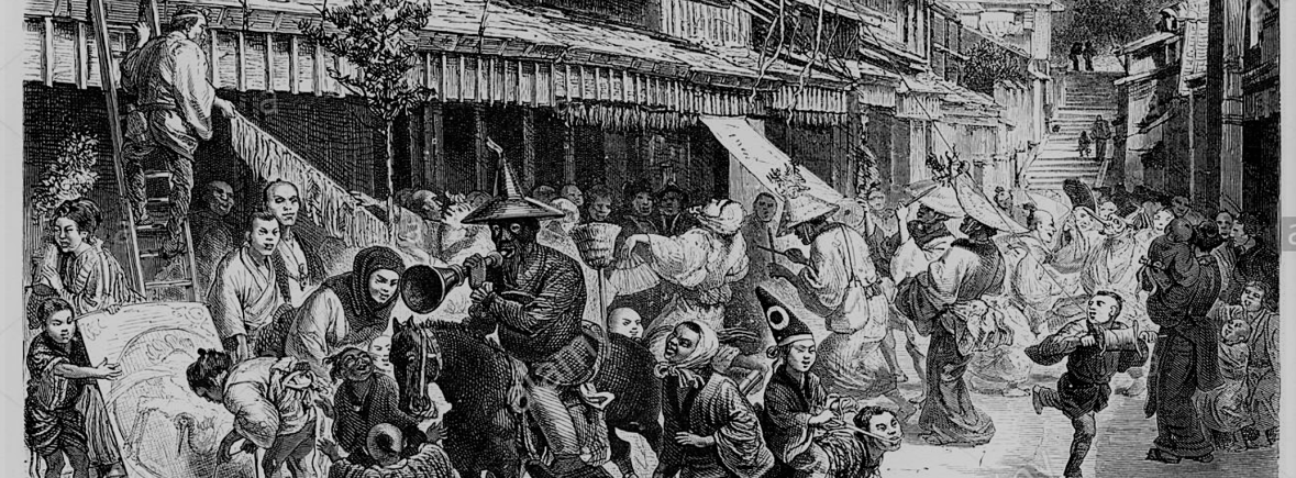 [Illustration : Aimé Humbert, « Personnes célébrant dans une rue de Tokyo le jour de l’an », gravure tirée du Japon illustré, 1875, réédition Genève: Slatkine]
